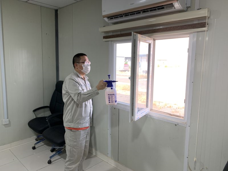在防疫物資緊缺的情況下,項目部通過與使館和中國商會協調、采取國內運送、當地采購等各種渠道購買了滿足項目部三個月使用量的防護口罩和酒精、消毒液等各類防疫物資,迅速組建起防疫物資與生活物資儲備庫,保障項目部現場員工的生命健康安全。
