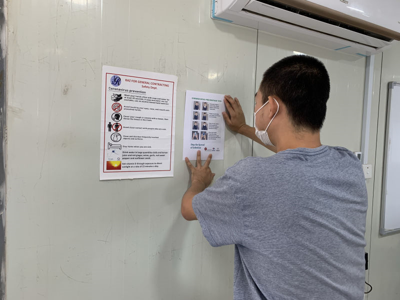 為做好當地員工的防疫宣傳工作,項目部還積極收集了中、英、阿三語的抗疫宣傳資料向當地員工發放,并在各個出入口等明顯位置張貼宣傳畫報,提高當地員工的疫情防控意識,給當地員工提供口罩、手套、消毒液等抗疫物資。在分發口罩時,中方員工示范佩戴方式,鼓勵大家少聚集、勤洗手,并倡議當地員工做好鄰里朋友的表率。這些舉措獲得了業主管理層的高度評價。