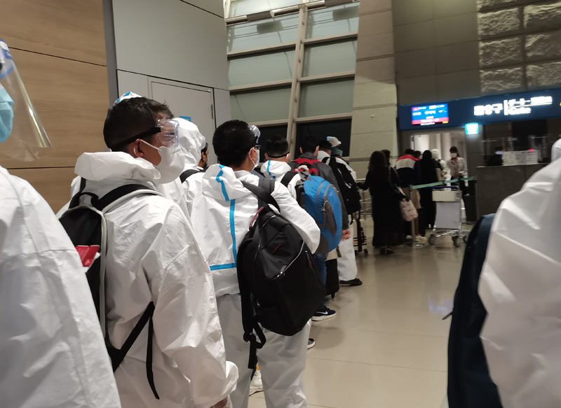 9月23日上午,項目團隊第一批返科團隊從貴陽出發,接受了臨行前的核酸檢查,領取了防護物資、防疫藥物,并以承諾人身份簽署了嚴格遵守疫情防控隔離要求書。此次征程艱難曲折,貴陽--成都--首爾--迪拜(隔離14天)--科威特(隔離14天),其中最長候機時間超過14個小時。項目團隊歷時近1個月終于到達項目現場,其中艱難可想而知。
