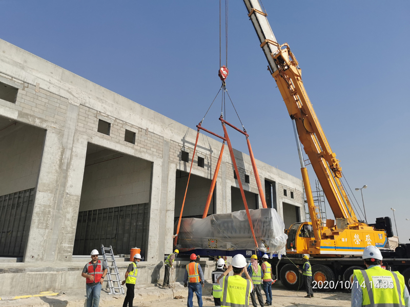 科威特國際機場項目設計了兩個11千伏開關站,共計25臺15KV/3500KVA柴油發電機組,作為T2航站樓的應急電源,是航站樓應急時刻的關鍵“心臟”。柴油發電機組作為科威特機場項目履約的重要節點,業主、監理、總包等各方高度重視,從設備進場、卸貨、檢驗、轉運到吊裝的全過程,各方代表均蒞臨施工現場指導監督。